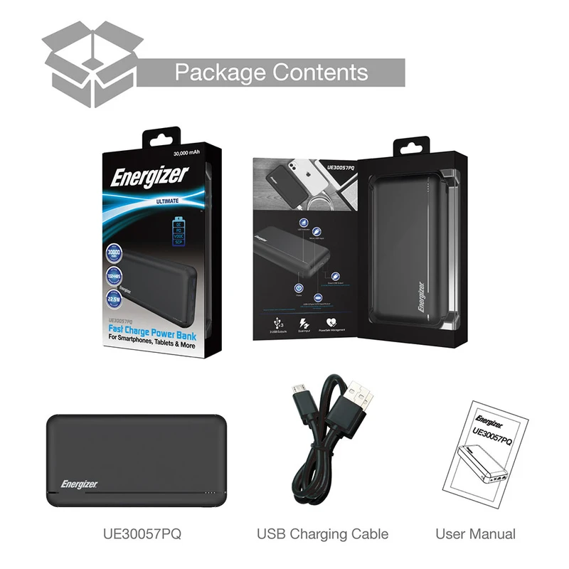 شارژر همراه انرجایزر مدل UE30057PQ، دارای یک تکنولوژی شارژ نوآورانه و جهانی است که سرعت شارژ را به حداکثر می‌رساند و قابلیت سازگاری با بیشتر دستگاه‌ها را دارد. این پاوربانک با توجه به مشخصات دستگاه مورد استفاده، از یک موتور سرعت دوبل که دارای فناوری پیشرفته استفاده کرده و با استفاده از تکنولوژی PD و QC.3 باعث بالا بردن سرعت شارژ دستگاه می‌شود. از این محصول می‌توان برای شارژ کردن تلفن‌های هوشمند، رایانه لوحی و موارد دیگر استفاده کرد. Energizer UE30057PQ، دارای ظرفیت 30000 میلی‌آمپر ساعت است که سه خروجی مانند 2 USB-A هوشمند و 1 USB-C را دارد. فناوری USB-C Power Delivery به شما این امکان را می‌دهد تا iPhone8/8 Plus/X/XR/11/11Pro را تنها در 30 دقیقه از 0 تا 50 درصد شارژ کنید. هم‌چنین پورت USB-C این دستگاه، از شارژ سریع برای سامسونگ، هوآوی و سایر دستگاه‌های سازگار با سیستم عامل اندروید پشتیبانی می‌کند. نشانگر LED سطح باتری و وضعیت شارژ را در یک نگاه سریع نشان می‌دهد. UE30057PQ یک پاوربانک مناسب برای گوشی‌های هوشمند، رایانه لوحی و موارد دیگر است. با توجه به اینکه در آینده نزدیک، نسل جدید گوشی‌های هوشمند با توان 18W به بالا شارژ می‌شود، کمپانی انرجایزر با به کارگیری پیشرفته‌ترین تکنولوژی در پاور بانک، دست به تولید اولین پاوربانک با توان خروجی 22.5W را در جهان زده است. اگر از کابل اورجینال گوشی همراه خود استفاده کنید، با این پاوربانک می‌توانید به صورت سوپر فست شارژ که در گوشی‌های نسل جدید مانند OPPO -Huawei- iPhone-Samsung است، دستگاه خود را شارژ کنید.